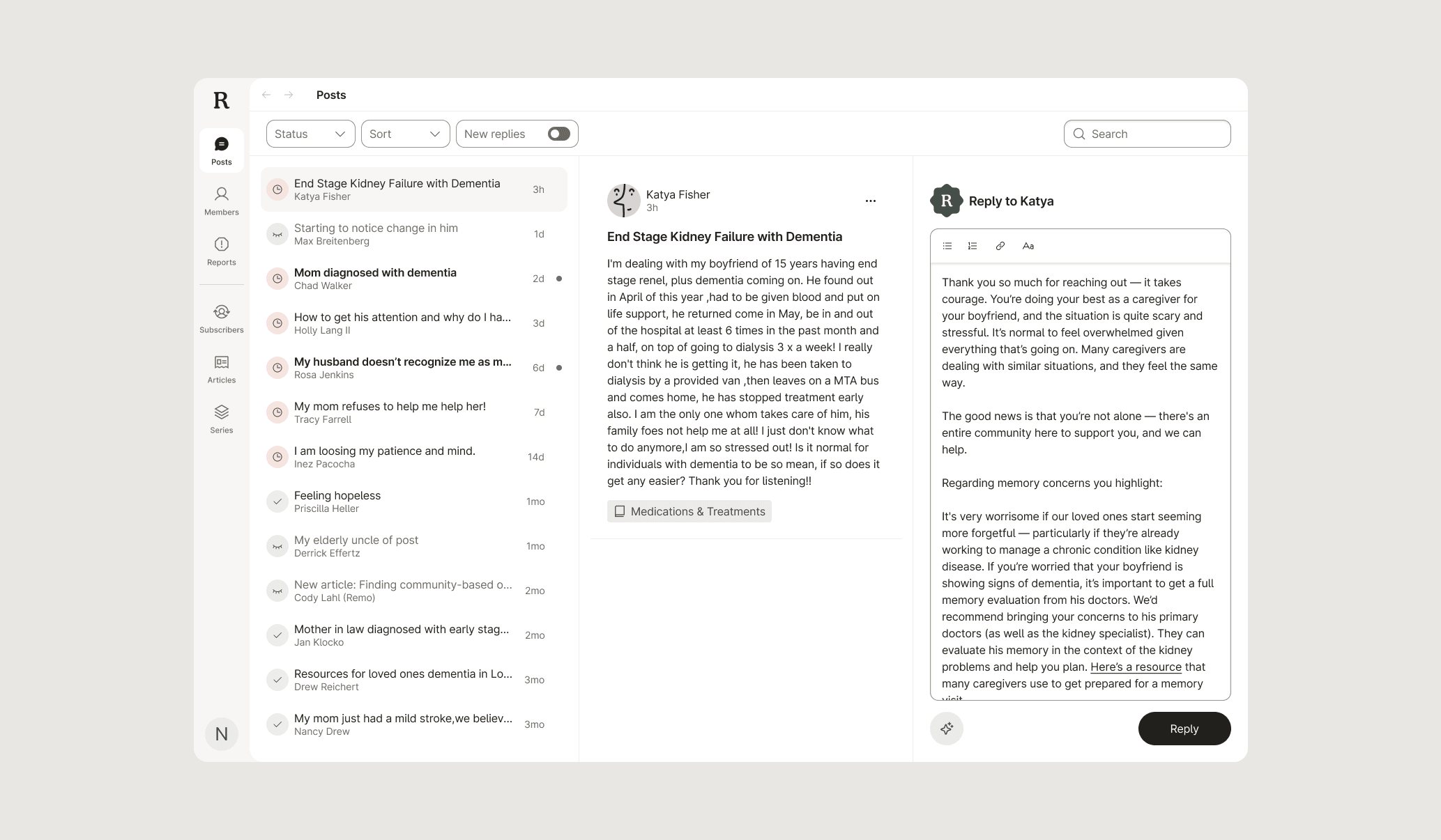 As this Community would eventually scale, so did our need to evolve our existing way of responding to posts. The MVP workflow had our team logging in and replying like any other user, so we set out to improve this experience with a bespoke system to help them manage and write replies. After a quick turnaround, we launched our new Care Experts tool, setting the groundwork for future scale.